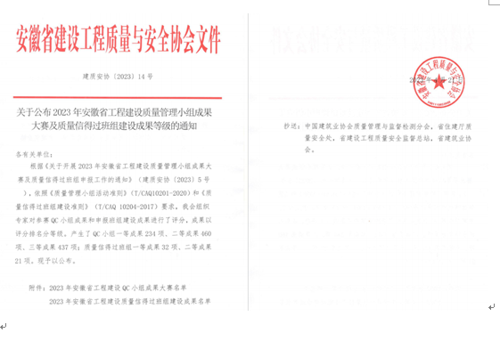 近日,安徽省建設(shè)行業(yè)質(zhì)量與安全協(xié)會公布了2023年安徽省工程建設(shè)質(zhì)量管理小組及信得過班組建設(shè)活動成果獲獎名單,合肥建工申報(bào)的10項(xiàng)QC小組活動成果榮獲省級QC成果獎。